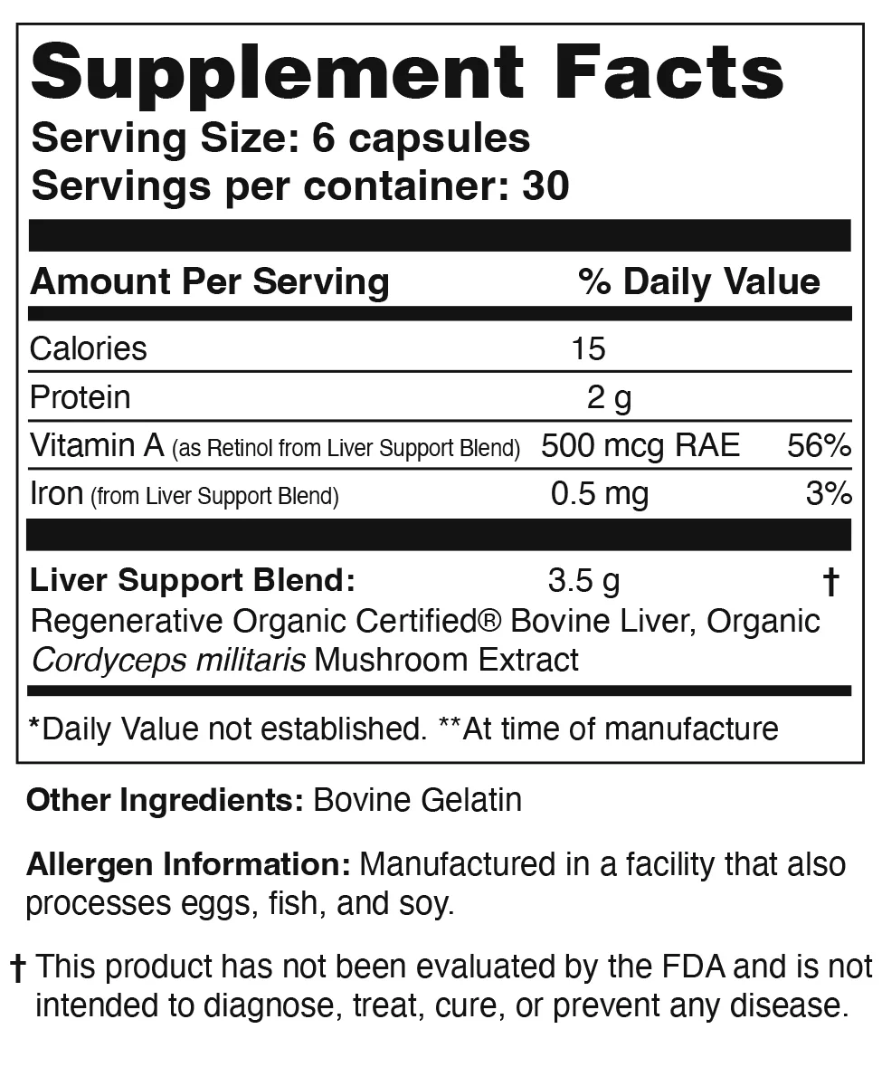 INGREDIENTS: Liver Support Blend: Regenerative Organic Certified Bovine Liver, Organic Cordyceps Militaris Mushroom