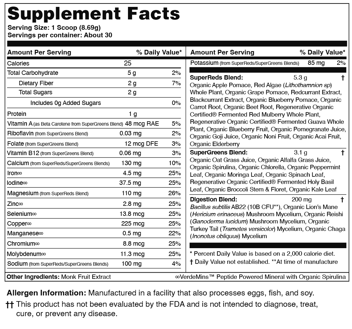 Organic Apple Pomace, Red Algae (Lithothamnion sp) Whole Plant, Organic Grape Pomace, Redcurrant Extract, Blackcurrant Extract, Organic Blueberry Pomace, Organic Carrot Root, Organic Beet Root, Regenerative Organic Certified® Fermented Red Mulberry Whole Plant, Regenerative Organic Certified® Fermented Guava Whole Plant, Organic Blueberry Fruit, Organic Pomegranate Juice, Organic Goji Juice, Organic Noni Fruit, Organic Acai Fruit, Organic Elderberry