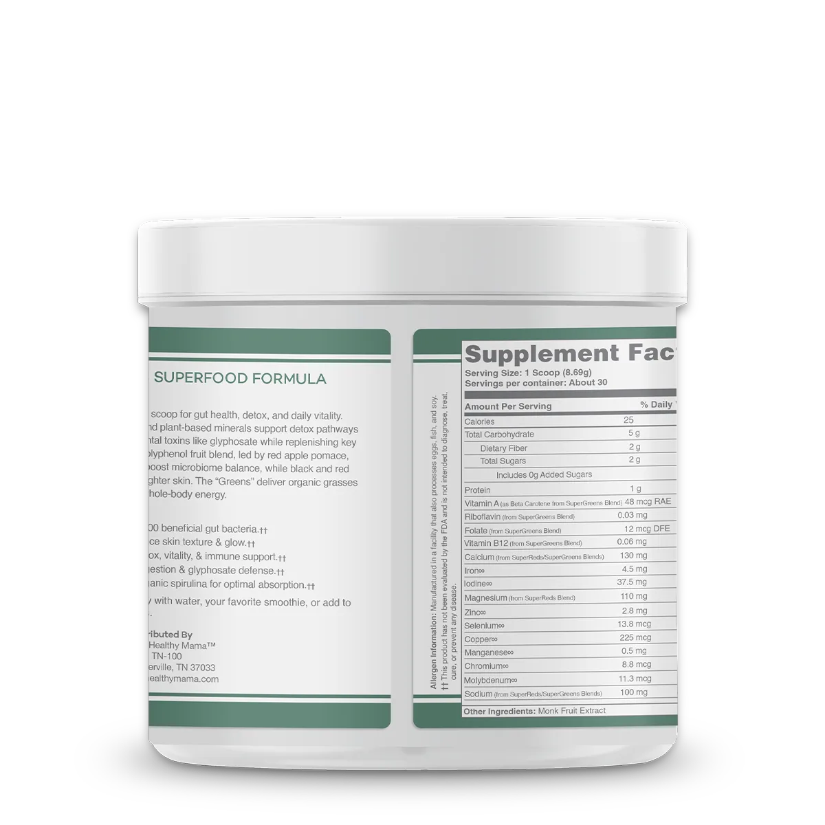 Daily Reds & Greens is your all-in-one scoop for gentle detox and full-body nourishment. A clinically studied AB22 probiotic, high-polyphenol fruits, organic greens, and adaptogenic mushrooms work together to support digestion, gut balance, and the body’s natural detox pathways, including the breakdown of environmental toxins like glyphosate. With bioavailable plant-based minerals and microbiome-boosting reds, it helps you feel vibrant, balanced, and thriving every day.