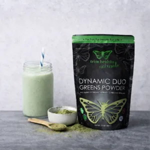 Both of our chosen greens are safe for pregnancy and nursing seasons, as well as children of all ages. Our spirulina is grown in pure water wells free of contaminants and is irradiated and microcystin-free. Our only word of caution is that with two ingredients sooooooo powerfully nutritious, they are also powerfully green tasting. You can’t expect to just mix this powder with water and shove it down the hatch. Dynamic Duo is designed to be laced in recipes and treats that ease it down gently and make it surprisingly enjoyable. Don’t get anxious, we have you covered with ideas for getting the most out of your Dynamic Duo Greens Powder in our recipe book, Trim Healthy Future, and on our website, trimhealthymama.com. You’ll be whipping it up in ways that will get these greens working their mighty superpowers without you realizing anything other than deliciousness is being served.