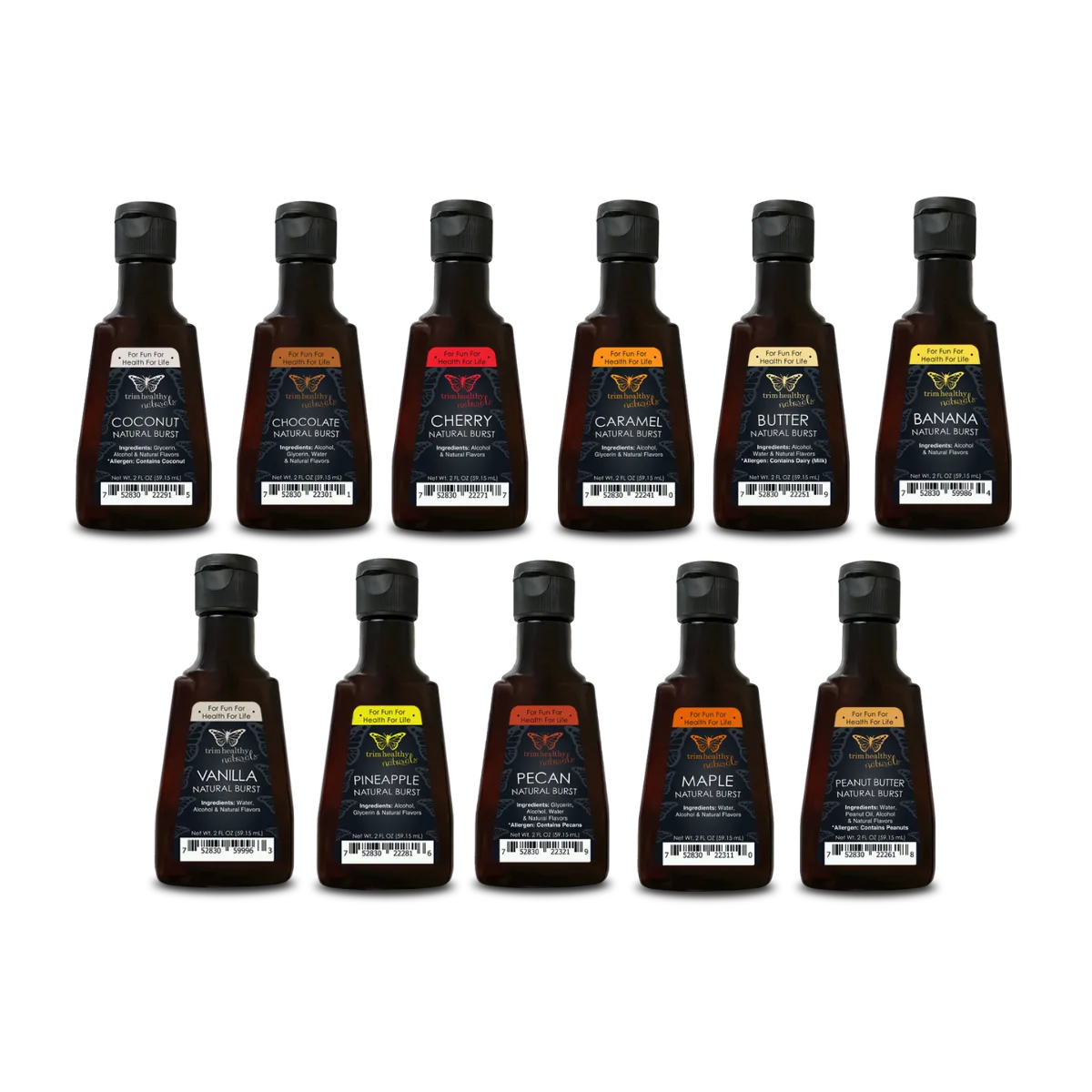 Enjoy ALL of our Natural Burst flavors: Apricot, Banana, Butter, Caramel, Cherry, Chocolate, Coconut, Maple, Peanut Butter, Pecan, Pineapple & Vanilla