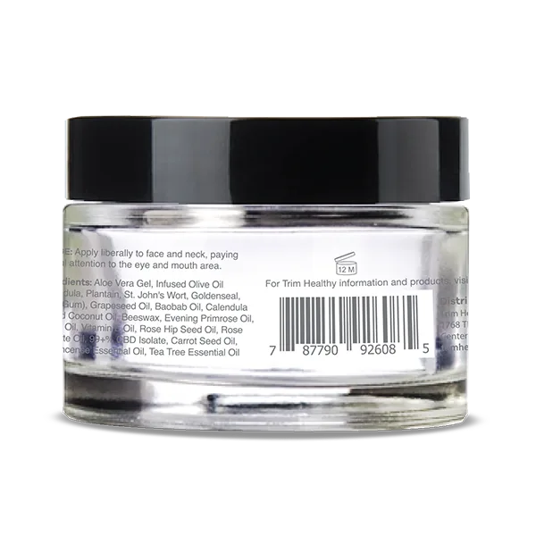 Ingredients: Aloe Vera Gel, Infused Olive Oil (Calendula, Plantain, St. John’s Wort, Goldenseal, Myrrh Gum), Grapeseed Oil, Baobab Oil, Calendula Infused Coconut Oil, Beeswax, Evening Primrose Oil, Jojoba Oil, Vitamin E Oil, Rose Hip Seed Oil, Rose Absolute Oil, 99+% CBD Isolate, Carrot Seed Oil, Frankincense Essential Oil, Tea Tree Essential Oil