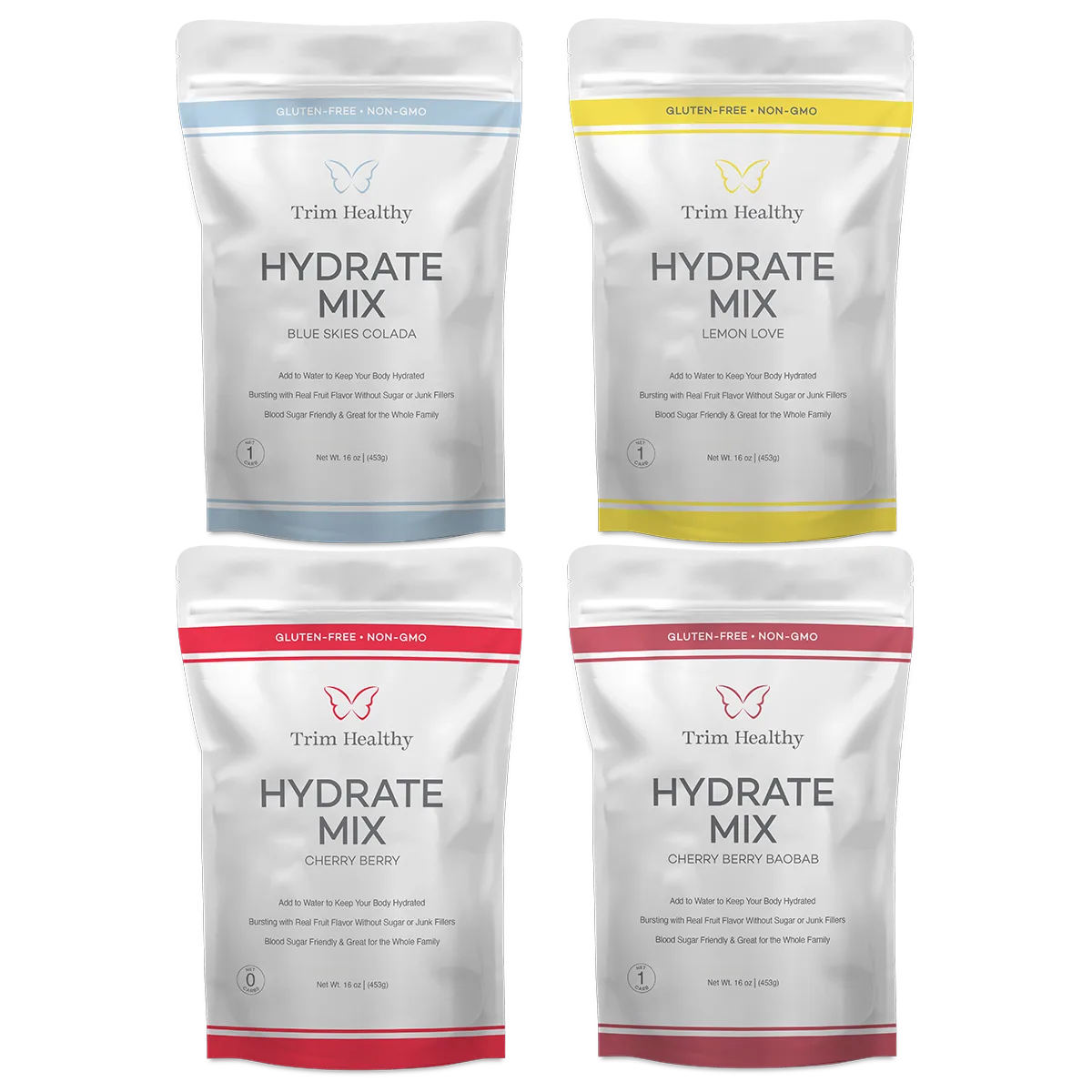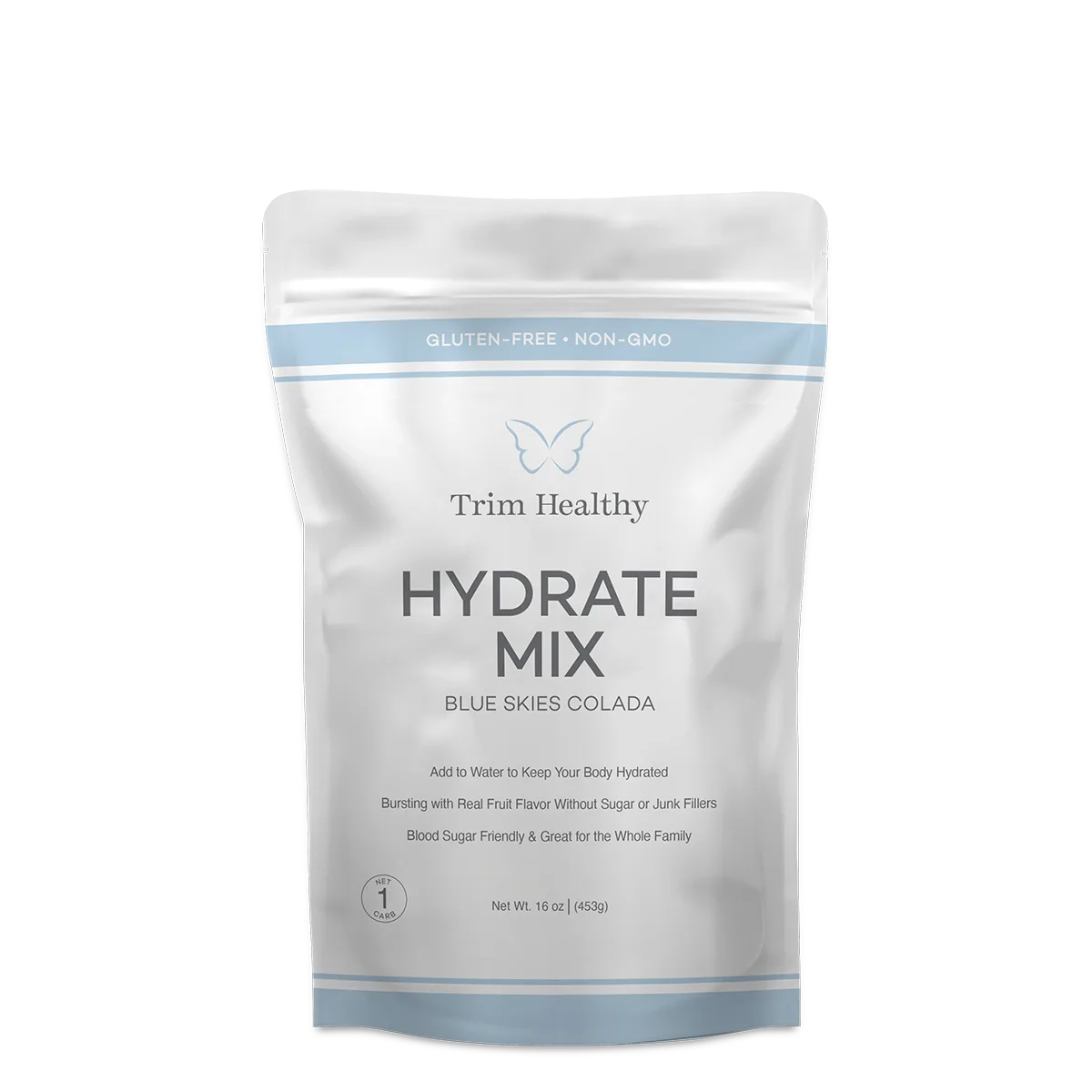 Trim Healthy Hydrates take water from boring to brilliant with just a shake or a stir. Ordinary water transforms into a drink of dreams with no harmful ingredients like sugar, unhealthy dyes, junk fillers, artificial ingredients, or even needless calories or carbs. Choose from Orange Oasis, Lemon Love, Cherry Berry, or Blue Skies Colada. Keep them in your purse, car, kitchen, or office and in your kids’ backpacks. Add one hydrate to a big glass or bottle of water, and you’ve got instant, all-natural, vibrant, and fun-tasting flavor you can finally get excited about drinking! As with all Trim Healthy products, we’ve got you and your family’s weight and health in mind. At last… You get to deliciously flavor up your water without the fattening and blood sugar spiking side effects. Cheers as you shake or stir, then gulp!